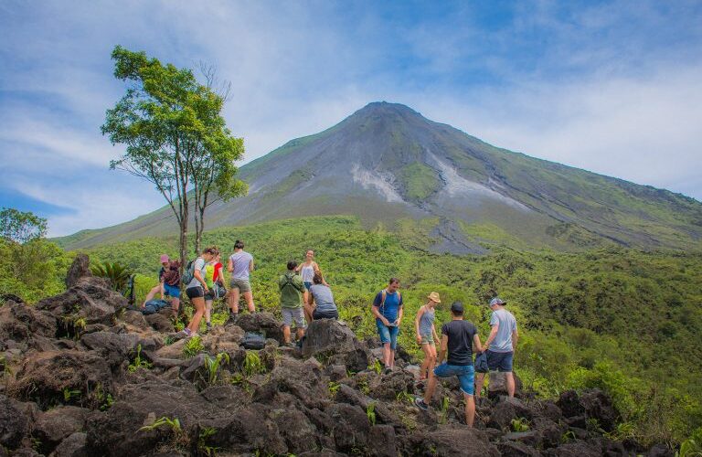 First we go to the majestic La Fortuna waterfall, which is 70 meters high; where if the weather allows it, we will bathe in its crystal clear waters. We will be around one hour and thirty minutes in this place; then we will take the minibus to go to the next point and one of the most spectacular, the incline walk in the rain forest towards the base of the Arenal volcano, where we will visit the lava flows from the years 1525, 1968 and 2010; also while we enjoy this beautiful ecological park we will learn about the trees and animals that inhabit this place. (About two hours up to the base of the volcano, and one hour down to the green lagoon). After the descent we will enjoy a swim in a totally clean green lagoon with volcanic formation. Once we have enjoyed this, we will have a traditional lunch. To finish we return to the bus to go to the natural river of hot springs (Rio Tabacón), where we will enjoy a majestic place, and also enjoy a mud mask from the base of the Arenal volcano. For after a great day of adventure and experience, be returning to La Fortuna around 4pm.